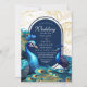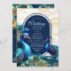 Moderna y elegante invitación a la boda con pavos reales. Oro azul verde y turquesa con línea dorada, escritura clásica, caligrafía elegante y minimalista (imitación de polvo de plata y oro). Hermosa y elegante, sencilla y moderna invitación a la boda.