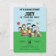 This Peanuts birthday invitation design features Charlie Brown, Snoopy, Lucy, Linus, Sally, Schroeder, Woodstock, and friends gathered on a classic baseball field scene, creating a playful and nostalgic game day celebration.