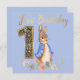 Pedro el conejo sobre fondo azul con texto "Primer cumpleaños" en oro y número uno en oro.
