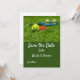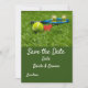 Pelota de tenis en césped verde con invitación de boda de amor para guardar la fecha