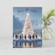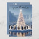 Penguins gather around a glowing white Christmas tree on a floating ice platform in a serene, icy landscape.