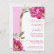 Estas invitaciones nupciales tienen un tema floral rosa bonito con flores de peonía acuarela. El fondo es de color bebe rosado, con un marco de arco dorado a la derecha. Dos ramos de fuchsia y peonías rosadas se colocan en rincones opuestos. Es un diseño hermoso y femenino adecuado para un boda en cualquier época del año.