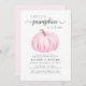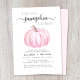La invitación a la ducha de una linda pareja de niñas de otoño con "A Sweet Little Pumpkin Is On Her Way" escrita en tipografía gris y un guión elegante, y una acuarela rosa pastel de una calabaza. Personalice el nombre de la madre y los detalles de la ducha en una tipografía simple.