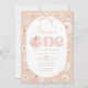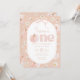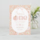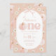 ¡Una calabaza linda! Calabaza floral y arco Invitación temática de primer cumpleaños con fondo de melocotón con margaritas, calabaza y adorable arco rosado.