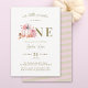 Una invitación tierna, dulce y elegante para un chica bebé fiesta de primer cumpleaños, con un tema de calabaza rosa, perfecto para Halloween o la caída, la cosecha, etc. Se trata de una pintura acuarela de calabaza rosa y rosas rosas rosas, así como de algunas hojas de otoño. La parte trasera está recubierta de una textura simple de color rosado y una franja de color agudo que coincide con la tipografía y la caligrafía.
