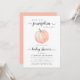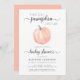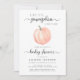 Una linda invitación a bañarse en una ducha de bebé neutral en cuanto a género que incluye "A Sweet Little Pumpkin is On Your Way", escrita en una mezcla de tipografía gris y escritura elegante con toallitas, y una acuarela naranja pastel de una calabaza. Personalice el nombre y los detalles de ducha de la madre en una tipografía sencilla y moderna. Indique el género del bebé si lo desea (por ejemplo, "está en camino").