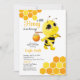 Pequeña miel está en camino a la plantilla de la invitación a la ducha de abejas. Abeja dulce caminando con miel, peines de miel, invitación a la ducha de bebé amarilla.