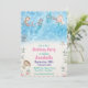 Esta colorida y encantadora invitación a la fiesta cuenta con una Sirenita en la playa. Cuatro pequeñas sirenas adorables están nadando en el agua. Dos de ellos están nadando bajo el agua y dos están saliendo de ella. La información fiesta está impresa en la parte de arena de la playa. Las marismas, una estrella de mar y el follaje marino acentúan los bordes de la arena. Las imágenes se imprimen en un bonito diseño de pintura acuarela.