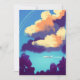 El ilustracion digital muestra grandes y vívidas nubes naranjas que reflejan los rayos de la puesta del sol. El cielo es azul claro y se puede ver un pequeño avión blanco. Hay árboles oscuros con flores rosas en primer plano