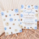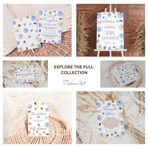 Calabaza Azul Boho otoño Cae Floral Bebé niño Invitación a ducha. Con un hermoso patrón de calabaza de acuarela floral sobre un fondo blanco. Personalizable fácil para su evento especial. El tema perfecto para cualquier celebración bohemiana del otoño de una ducha de bebé neutra de género.