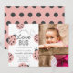 Esta encantadora y moderna invitación a la foto del cumpleaños de un chica muestra un fondo blanco con ladybugs en rosa claro. En el reverso aparece un fondo rosado con patrones de puntos polka negros. Personalice sus necesidades. Puedes encontrar más productos a juego en mi tienda.