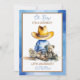 Invitaciones a la ducha de bebé azules y marrones con un niño pequeño en un gorra de vaquero sentado con un oso de peluche, un tren y una niña. Ducha de bebé de un niño de temática campestre y occidental.