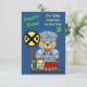 Esta es una adorable invitación para una fiesta de cumpleaños para un niño pequeño, y puede trabajar para cualquier edad, ya que usted puede fácilmente personalizar todo el texto, tanto en la parte delantera como en la trasera. Se trata de una bonita imagen de oso de peluche marrón claro vestido con una gorra y un overol de un ingeniero de trenes de rayas azules. Un cartel amarillo y negro que cruza el ferrocarril está a su lado, y un tren de juguete con pistas está a sus pies. La imagen y el texto se colocan en un fondo azul. La parte trasera de la invitación tiene el texto de su personalizado en amarillo claro, y una segunda imagen del ingeniero de oso de peluche. ¡A los niños y a los adultos les encantará! *Gracias a Real Deal Clipart por el cliente usado para crear este diseño.