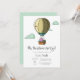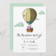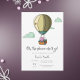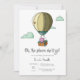 Pequeña y sencilla invitación a la ducha de bebé con el ilustracion de un oso de peluche rosa en un globo aerostático flotando. Personalice el texto con su propio texto. Ilustrado y diseñado por Patricia Álvarez.