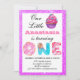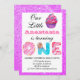 Invitación de primer cumpleaños con donut y letras de dulces del purpurina de torta morada. Añade fácilmente tu nombre completo, y la fecha, hora y dirección de la fiesta de cumpleaños. ¡Perfecto para una princesa dulce que se vuelve una!