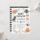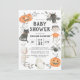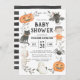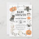 Invite a los huéspedes a su ducha de bebé con temática de Halloween con estas adorables invitaciones para duchas de bebé. La ducha de bebé de Halloween invita a mostrar "Baby Shower" en tipografía con letras a mano con los detalles de tu ducha abajo. La frontera incluye lámparas de color agua pintadas, murciélago, monstruo Frankenstein, araña, fantasma, momia y un gato negro complementado por follaje gris. En la parte trasera de la invitación hay rayas acuáticas pintadas en blanco y negro.