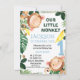 Los niños invitan al primer cumpleaños a pequeños monos con el tema de los monos, con dos pequeños monos, plátanos y vegetación tropical. Un lindo diseño de invitación para el cumpleaños de un mono travieso en su primera fiesta de cumpleaños.