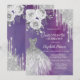 Elegante vestido de plata, flores y purpurina plateado goteando sobre un fondo morado.