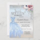 Elegante vestido azul, flores y purpurinas plateados gotean sobre un fondo plateado.