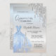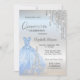 Elegante vestido azul, torre Eiffel y purpurina plateado gotea sobre un fondo plateado.