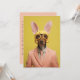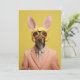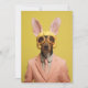 Un dachshund elegante vestido para Pascua con un traje rosa pastel, corbata a rayas y casco con orejas de conejo amarillas, exudando encanto y fantasía contra un fondo amarillo brillante. Una mezcla perfecta de elegancia y humor para una celebración festiva de Pascua.
