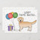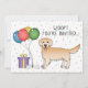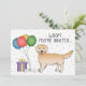 Diseño temático de cumpleaños lindo con el ilustracion personalizado original de Destei de un lindo abrigo amarillo color perro de raza Golden Retriever. El perro tiene una expresión de cara feliz con ojos amables y la lengua rosa del perro está mostrando. Al lado del perro hay globos de cumpleaños coloridos atados sobre un hueso de perro y una caja de regalo de color morado y amarillo. El fondo está decorado en tonos pastel y con un fondo blanco. Personalice las áreas de texto de ejemplo con los detalles de su evento.