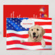 Golden retriever sobre fondo de bandera americana para invitación de fiesta del 4 de julio