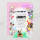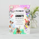 Esta invitación incluye un Bulldog francés, Samoyed, Jack Russell Terrier, un pastor alemán, maltés, corgi, shih tzu, Akita Inu, y un pastor anatoliano sobre un fondo acuarela con un pastel de vainilla y huellas de pata de galletas.