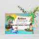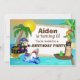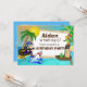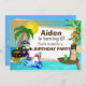 Cambiar fácilmente el nombre, edad y detalles del fiesta del niño en esta invitación a la fiesta de cumpleaños. Un pirata con una espada en una mano y un gancho en la otra protege su tesoro de monedas de oro de un tiburón. Una rana y un loro miran a lo lejos. La rana está sentada en un bote de remos marrón de madera que tiene una bandera de cráneo blanca y negra. El loro verde está sentado encima de la bandera y con una bufanda pirata roja en la cabeza. Hay un mapa del tesoro en la parte trasera del barco. Todos están en un paraíso tropical con agua azul, arena fina, altas palmeras y un sol amarillo cálido. Esta plantilla de invitación de cumpleaños se puede personalizar fácilmente para sus necesidades.