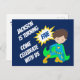 Tarjetas postales de cumpleaños de superhéroe personalizadas y geniales con el nombre de tu hijo en ellas. Invitaciones de cumpleaños personalizadas para niños pequeños en verde y azul para un héroe de acción. Personaliza en la burbuja de acción para una fiesta de estilo cómic.