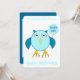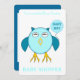 Esta impresionante invitación de Baby Shower incluye un lindo personalizado de un búho azul con ojos somnolientos, un pico abierto y lindas plumas suaves. El búho sostiene un globo azul en polvo. Hay un texto azul pálido en el globo que dice "Niño chico". Este es el regalo perfecto para celebrar a un bebé recién nacido. Hay texto de personalizable en la parte posterior para que puedas personalizar esta invitación.