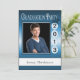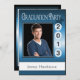 El tope de inicio se sienta sobre la fecha de graduación del personalizado. Sube tu foto de la escuela secundaria o la universidad y personaliza tu nombre y fecha en la parte delantera. Rellena los detalles de tu fiesta en la parte posterior. Mostrado en azul, negro y blanco con brillo metálico.