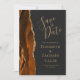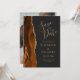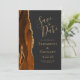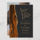 Esta elegante y moderna tarjeta de fecha guarda una acuarela de color naranja quemada con borde geodésico recortada con falso purpurina de oro. El texto de color dorado aparece en un fondo oscuro de color negro oscuro. Sustituir fácilmente la imagen de muestra en el reverso por una foto vertical del futuro novio y novia.