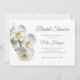 Invitación a la ducha de novias con orquídeas blancas en papel horizontal. Orquídeas blancas realistas con centros amarillos decoran el lado izquierdo del papel blanco con texto personalizado gris oscuro. Bonito, diseño sobrio para un evento tropical temático para celebrar la Novia. Se muestra una tarjeta de menor tamaño que se puede cambiar. Revertir es gris sólido.