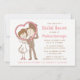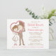 Sumérjase un poco de diversión en su ducha nupcial con estas adorables invitaciones a la ducha de novia personalizado rosa y marrón. La invitación incluye a una personalizado de una novia dibujada a mano con un vestido rosa y blanco con su novio dapper en un esmoquin marrón sosteniendo un gran corazón rosado. La información de tu ducha de novia está impresa como complemento de caligrafía rosa y fuentes marrones fáciles de leer resaltadas en un fondo blanco y nítido. La parte trasera de la invitación presenta un fondo rosa coordinador.