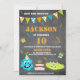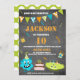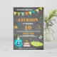Personalizado Funky Blue y Green Monstes con gorras fiestas, regalos, pancartas y pasteles fiestas, con antecedentes en pizarra y texto personalizado Invitación de cumpleaños para los niños cumpleaños,