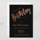 Crea una invitación personalizada y espléndida, moda y fiesta minimalista de cumpleaños para tu persona especial. Esta invitación incluye un amplio y hermoso guión de caligrafía escrito en falso rosa de Relieve metalizado dorado y con un fondo negro de pizarra. Puede personalizar fácilmente con su propio texto y personalizar a su gusto. Por favor, tenga en cuenta que el trabajo gráfico de "Cumpleaños" no puede ser editado. Nota adicional: La impresión de Relieve metalizado de oro rosa es un falso efecto de Relieve metalizado de oro rosa. NO es el verdadero Relieve metalizado de oro de rosa de sellado caliente.
