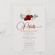 Una elegante y moderna "Petals and Prosecco", invitación a la ducha de novia con un tema de color crudo blanco con rosas de color rojo y blanco como piezas centrales con un toque de aliento para el bebé, así como vegetación, y dos estilizadas flautas de champán dorado (no oro real, este es un efecto digital), combinadas con caligrafía moderna con florecientes elegantes.