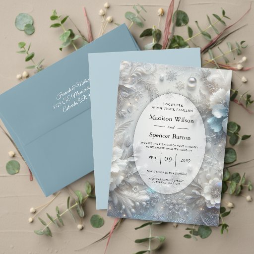 Celebra tu amor con la intemporal belleza del invierno en esta elegante invitación a la boda. Con delicados florales blancos y azules helados, hojas de plata brillantes, plumas suaves, copos de nieve y chispas sutiles, este diseño encantador evoca la magia de un maravilloso país con polvo de nieve. Perfecto para bodas de invierno, ceremonias de vacaciones o cualquier evento romántico en un entorno helado. El centro de gradiente suave ofrece un amplio espacio para la redacción personalizado, mientras que el borde ornamentado crea un marco lujoso. Una elección impresionante para las parejas que sueñan con un cuento de hadas de invierno.