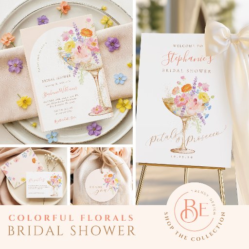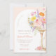 This stunning invitation features a golden prosecco glass adorned with delicate colorful florals and petals. The design is perfect for a chic Petals and Prosecco themed brunch and bubbly celebration.