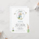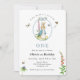 Flores silvestres de conejo de color de agua pintadas a mano azul y blanco y cintas azules para bebés niños 1ª invitación de cumpleaños.