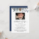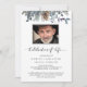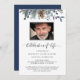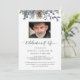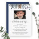 My condolences on your loss. Exquisite blue and sage foliage Memorial Service Announcement, Funeral Service Announcement invitation. A practical and delicate way to inform family and friends of funeral or gathering plans celebrating the life of your departed loved one. Card with loved one photograph showcased by graceful blue and sage green foliage arrangement and use of modern hand written Calligraphy details. Back of card in elegant navy blue color that can be changed to any other color you prefer by selecting customize further. Coordinating funeral guestbook available. Part of our "Rustic Blue Mountains" wedding and events collection.