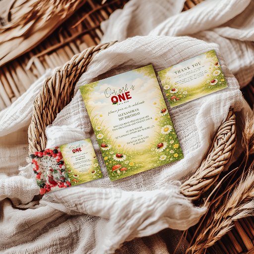 A cheerful garden scene filled with daisies, soft greenery, and playful ladybugs sets the tone for a sweet first birthday celebration. This design blends storybook charm with a warm meadow palette, creating a timeless look that feels joyful, gentle, and photo-ready. Perfect for a spring or summer celebration, with elegant typography and a bright, nature-inspired frame that highlights your party details beautifully.