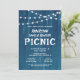 Esta invitación para pícnic de reunión familiar rústica presenta un fondo azul rústico acentuado con hileras de luces que adornan la parte superior de la invitación.