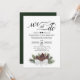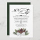 Esta bonita invitación a renovar la promesa boda presenta un diseño rústico y elegante con un cúmulo o ramo de pinceladas acuáticas pintadas a mano y ramas de pino atadas con un arco de satén blanco. El texto dice "seguimos haciéndolo" y está escrito en una elegante caligrafía de escritura. Hermosa manera de invitar a tus amigos y familia a compartir tu alegría mientras reafirmas tu amor por el otro. Ideal para una ceremonia al aire libre, invernal, de bosques o de montaña.