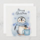 Una encantadora ilustración invernal de un adorable pingüinito que lleva un sombrero y una bufanda a rayas azules, que aporta un ambiente acogedor y festivo. Los copos de nieve suaves y los tonos azules suaves en el fondo crean una atmósfera invernal mágica. ¡Perfecto para tarjetas de Navidad, carteles, pegatinas y manualidades de temporada!