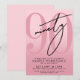 This modern birthday invitation features a soft light-pink-to-dark-pink gradient on the front for a feminine, stylish look. A deep dark-pink “90” spans most of the design, giving it a bold but minimal vibe. The handwritten script word “Ninety” sits in black, adding a sweet modern touch. All party details line up at the bottom in clean black text to keep everything easy to read.