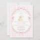 Featuring a soft pink gingham background, a sweet watercolor baby lamb with a bow, and a floral + ribbon wreath framing your party details, this invite is charming, gentle, and perfect for welcoming a baby girl.