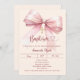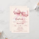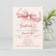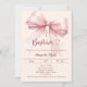 A soft cream, peach colored background, decorated with a pink large bow and, a golden cross. Personalize and add a name and details details.