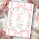 Our elegant "Pink Bow One Silly Goose Floral Girl 1st Birthday invitation" features a watercolor illustration of a white goose wearing a party hat and adorned with a pink bow, holding a pink balloon. The goose is framed by a decorative pink ribbon embellished with green floral motifs. The background is striped in white and pink.